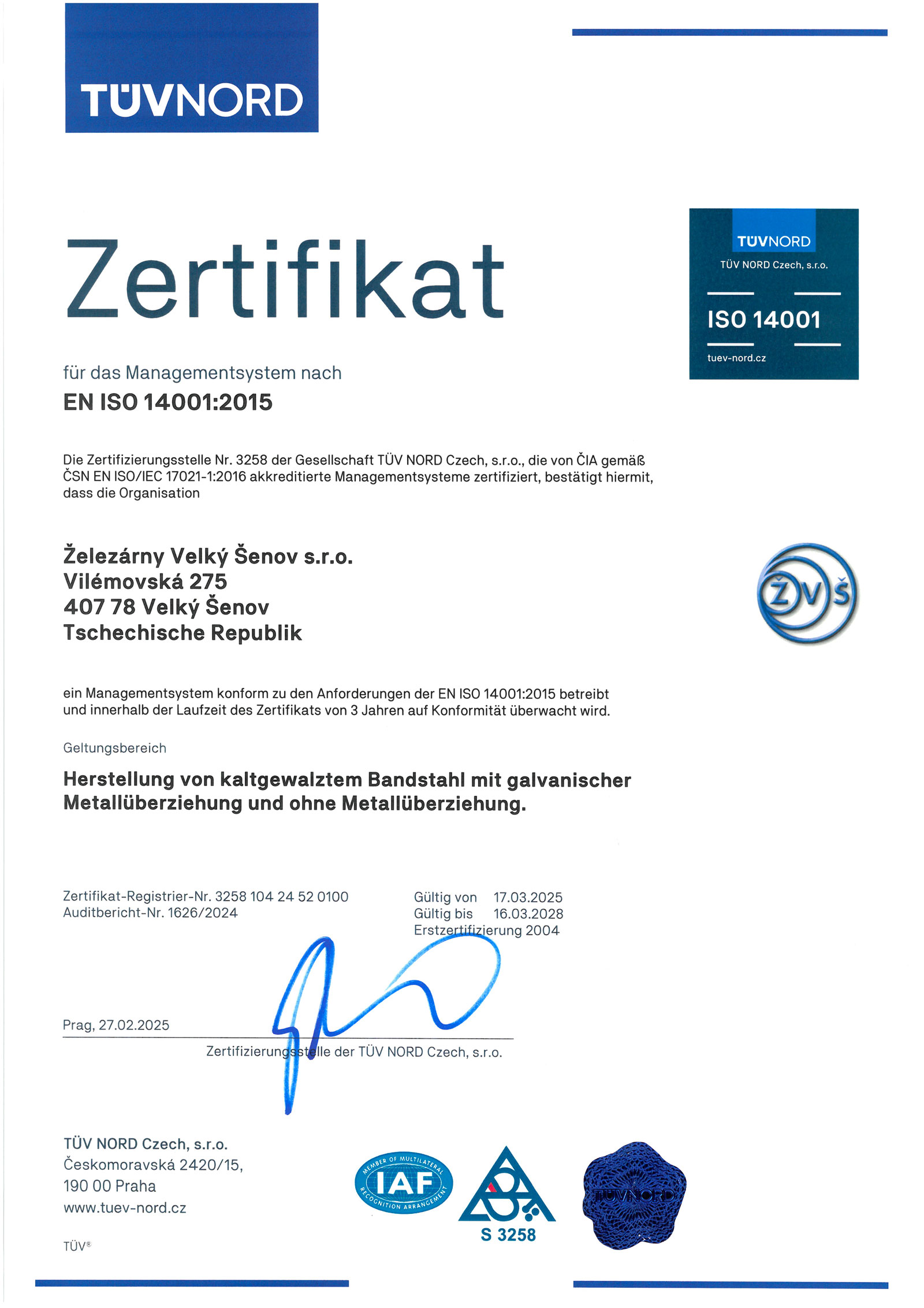 Die Gesellschaft Železarny Velký Šenov s. r. o. hat das Qualitäts System nach EN ISO 9001 (seit dem Jahr 1998) und nach EN ISO 14001 (seit dem Jahr 2004) eingeführt.