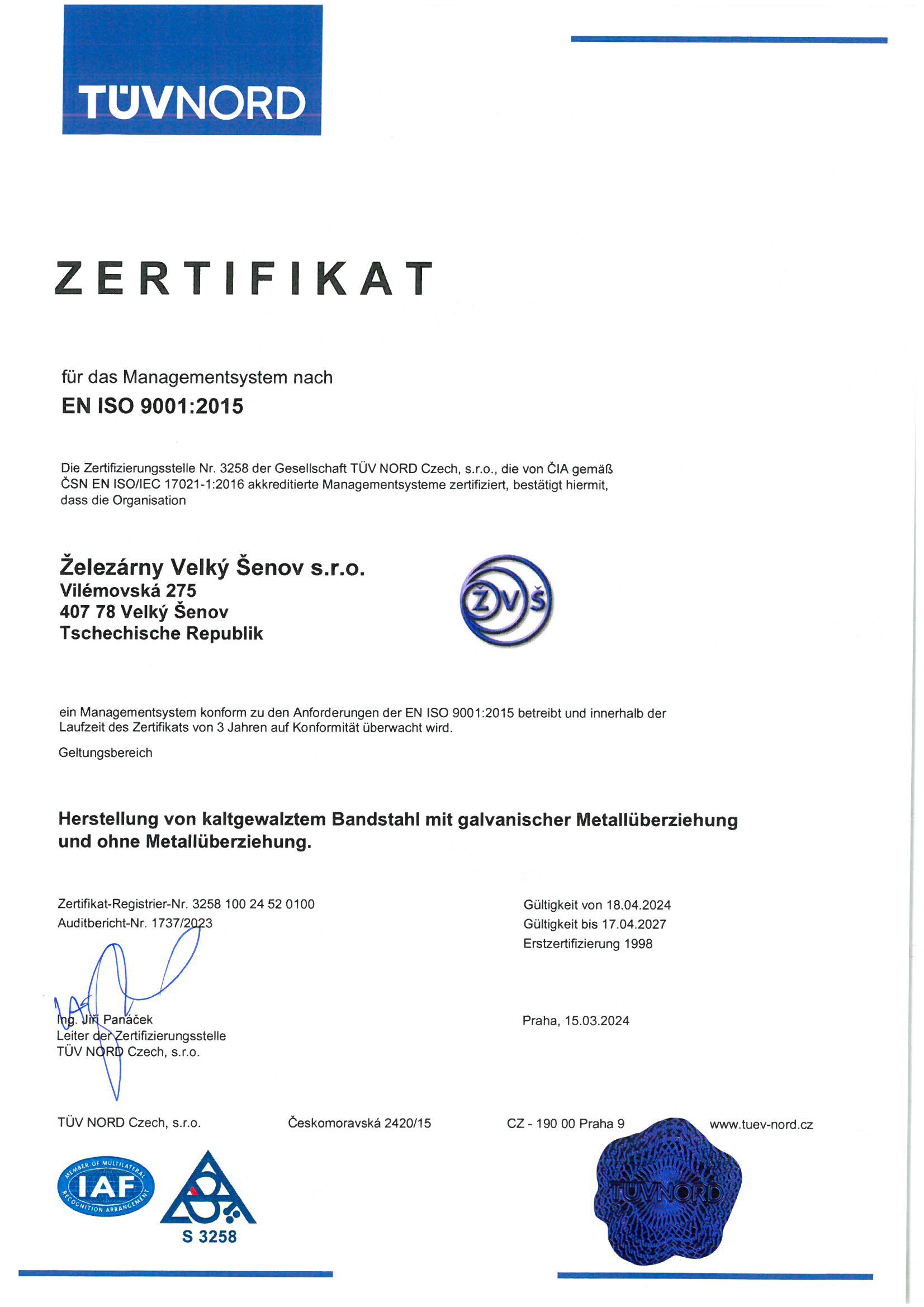 Die Gesellschaft Železarny Velký Šenov s. r. o. hat das Qualitäts System nach EN ISO 9001 (seit dem Jahr 1998) und nach EN ISO 14001 (seit dem Jahr 2004) eingeführt.