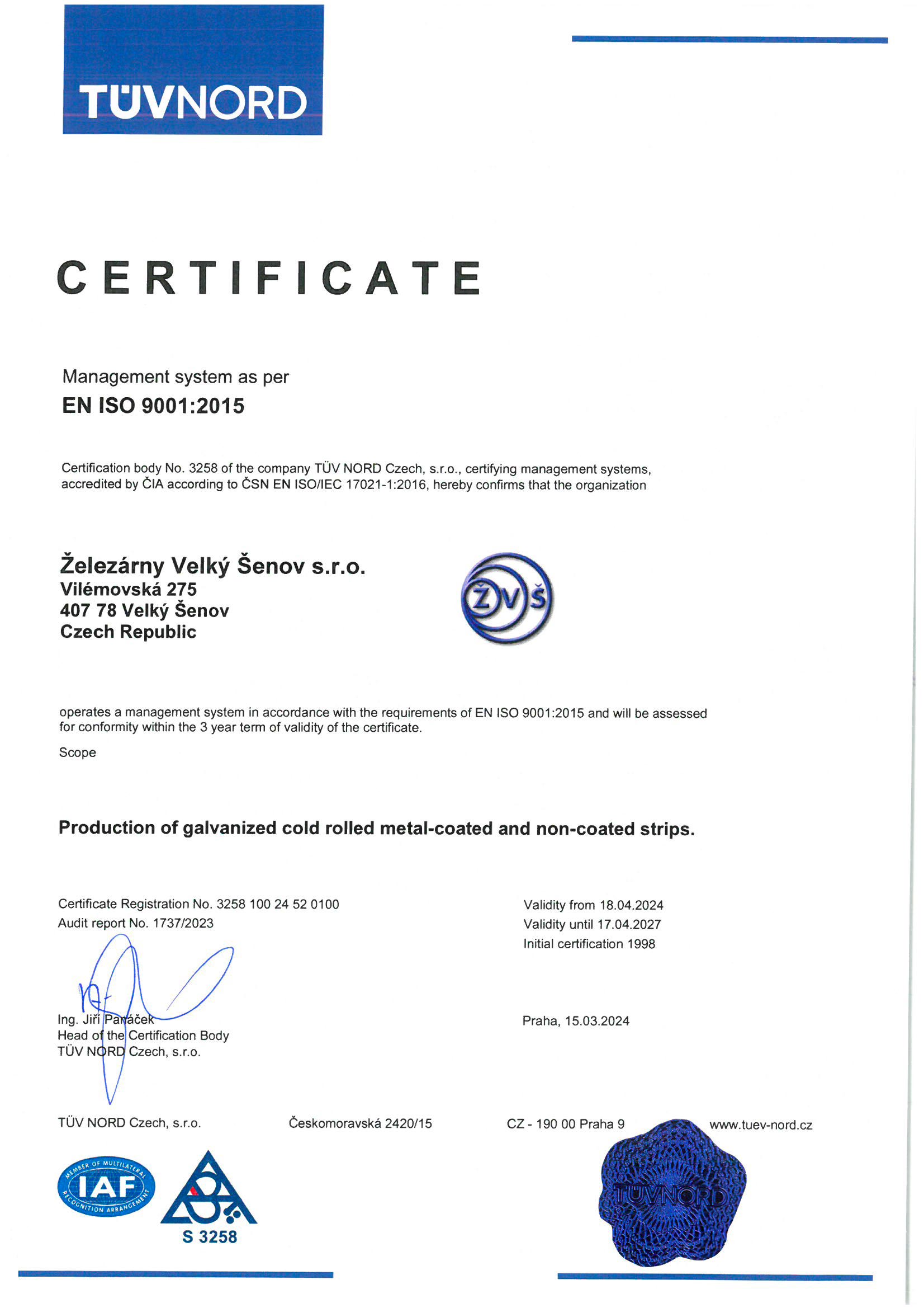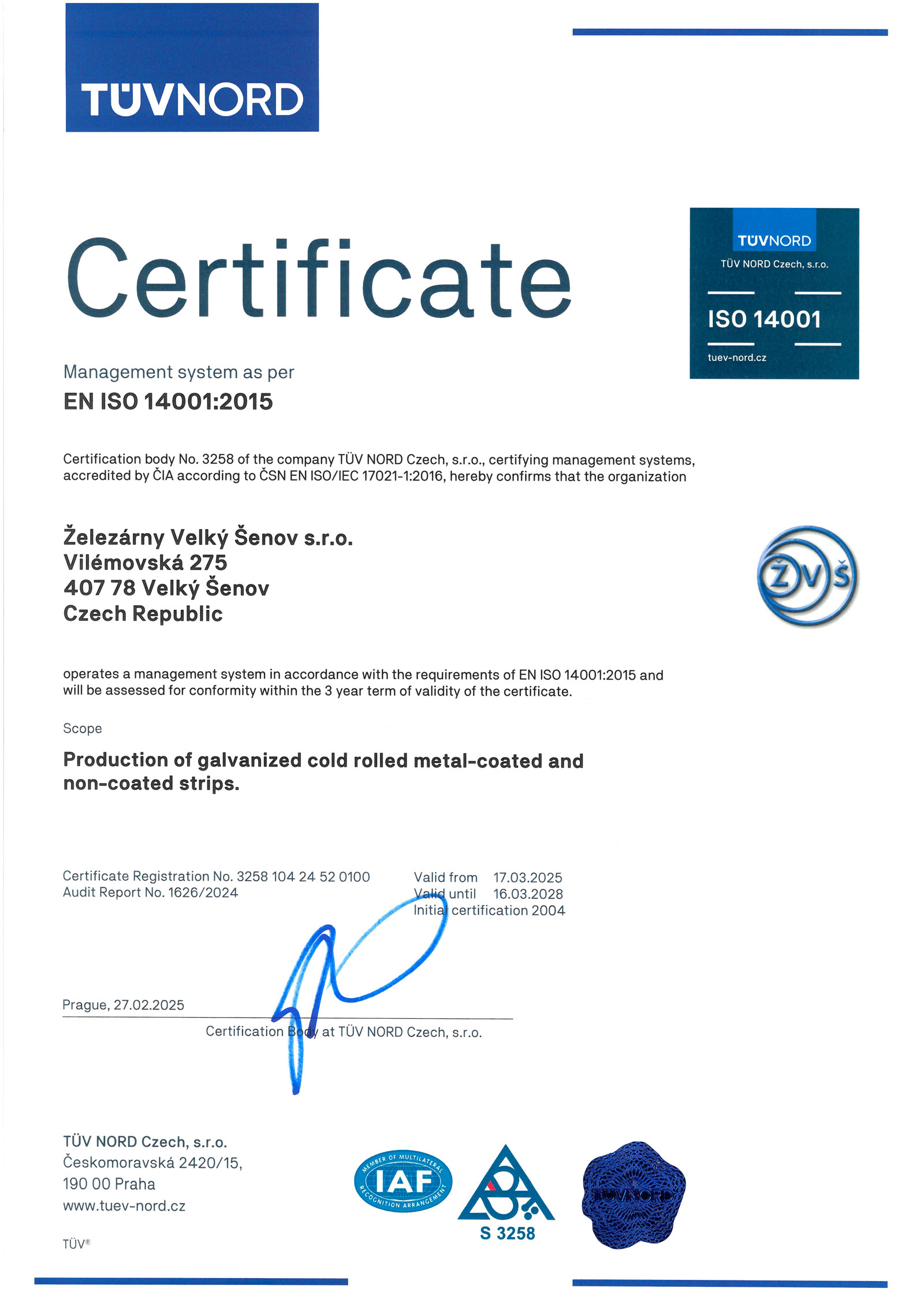 Company Železárny Velký Šenov s.r.o. has established and applies a quality system according to EN ISO 9001 (since 1998) and according to EN ISO 14001 (since 2004).